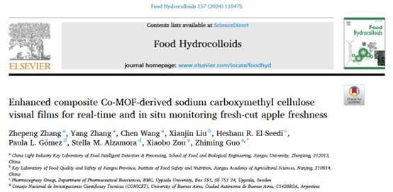 近日,我院郭志明教授课题组在国际Top期刊《Food Hydrocolloids》(Q1,IF2023: 11.0)上发表论文“Enhanced composite Co-MOF-derived sodium carboxymethyl cellulose visual films for real-time and in situ monitoring fresh-cut apple freshness”。bat365中文官方网站为第一完成单位,食生学院23级博士研究生张浙鹏为该文第一作者,我院郭志明教授为该文通讯作者。瑞典乌普萨拉大学的Hesham R. El-Seedi教授、阿根廷布宜诺斯艾利斯大学的Stella M. Alzamora院士和Paula L. Gómez教授也参与了论文的研究工作。