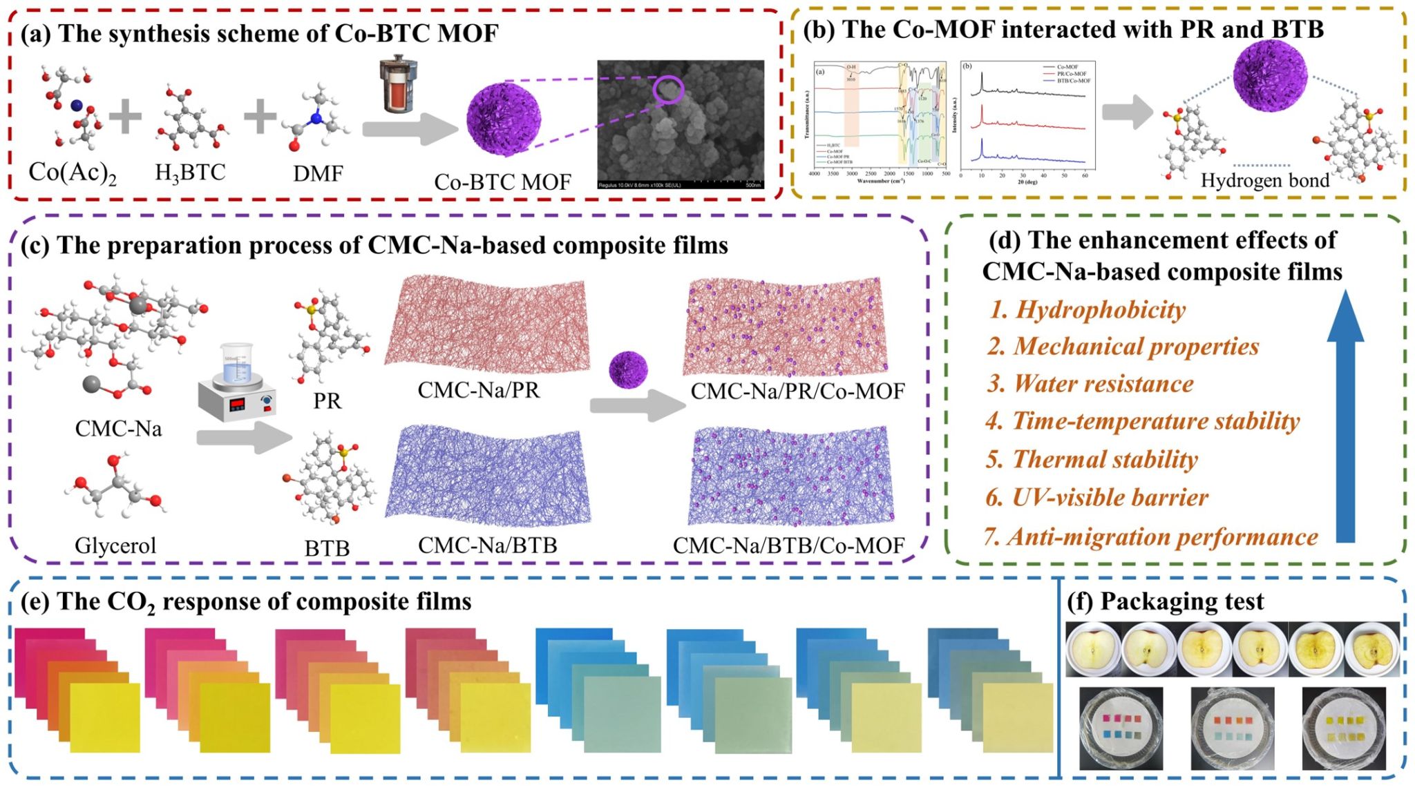 图1 鲜切水果新鲜度的Co-MOF可视化监测薄膜. (a) Co-BTC MOF的合成方案,(b) Co-MOF与PR和BTB的交互示意图,(c) CMC-Na基复合膜的制备工艺,(d)增强效果,(e) CO2响应,(f)包装试验