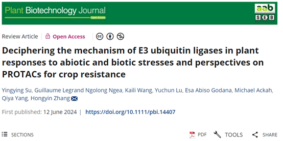 近日,我院张红印教授团队在植物学领域顶级期刊《Plant Biotechnology Journal》上在线发表论文“Deciphering the mechanism of E3 ubiquitin ligases in plant responses to abiotic and biotic stresses and perspectives on PROTACs for crop resistance”。bat365中文官方网站为第一完成单位,bat365中文官方网站硕士研究生苏盈盈与外籍博士后Guillaume Legrand Ngolong Ngea为共同第一作者,bat365中文官方网站张红印教授为通讯作者。