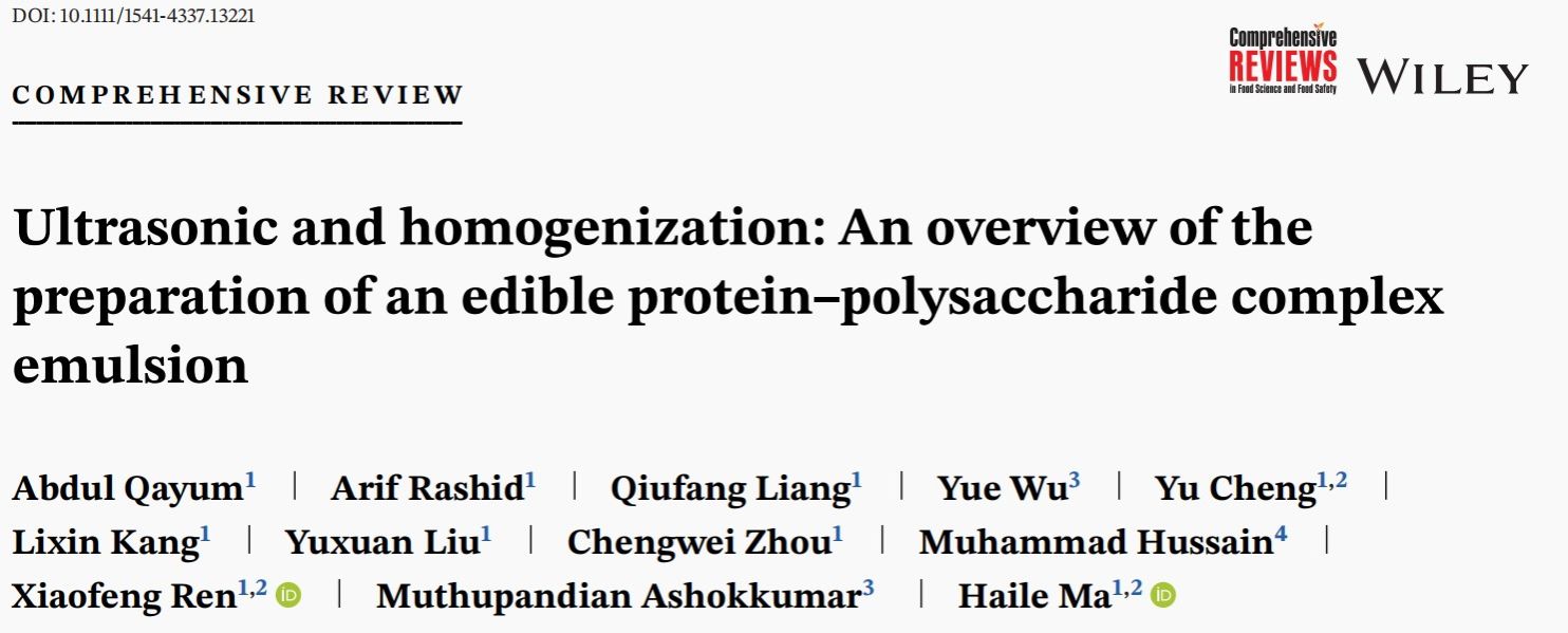 近日,bat365中文官方网站任晓锋教授课题组在国际食品安全和营养领域顶级期刊《Comprehensive Reviews in Food Science and Food Safety》(Q1,IF=14.8)在线发表了的最新研究成果——“Ultrasonic and homogenization: An overview of the preparation of an edible protein–polysaccharide complex emulsion”(DOI: 10.1111/1541-4337.13221)。bat365中文官方网站博士后Abdul Qayum为该论文的第一作者,任晓锋教授和马海乐教授为通讯作者。Ultrasonics Sonochemistry主编、澳大利亚墨尔本大学Muthupandian Ashokkumar教授和Yue Wu博士参与了论文撰写与修改工作。