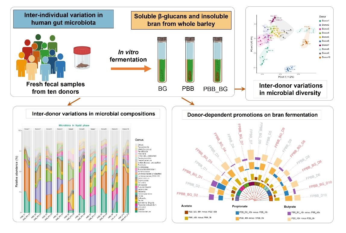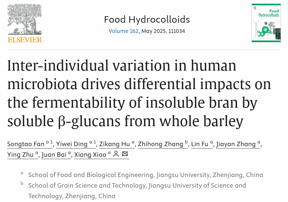 近日,我院肖香教授、范松涛讲师在在国际Top期刊《Food Hydrocolloids》(Q1,IF2023:11.0)上发表论文“Inter-individual variation in human microbiota drives differential impacts on the fermentability of insoluble bran by soluble β-glucans from whole barley”。bat365中文官方网站为第一完成单位,食生学院范松涛讲师和22级硕士研究生丁怡炜为该文共同第一作者,肖香教授为该文通讯作者。