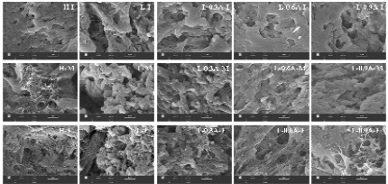 图2 L-Arg对不同加热阶段(A: setting; B: two-stage heating)的鱼丸不同部位(I: internal; M: middle; E:external)微观结构的影响