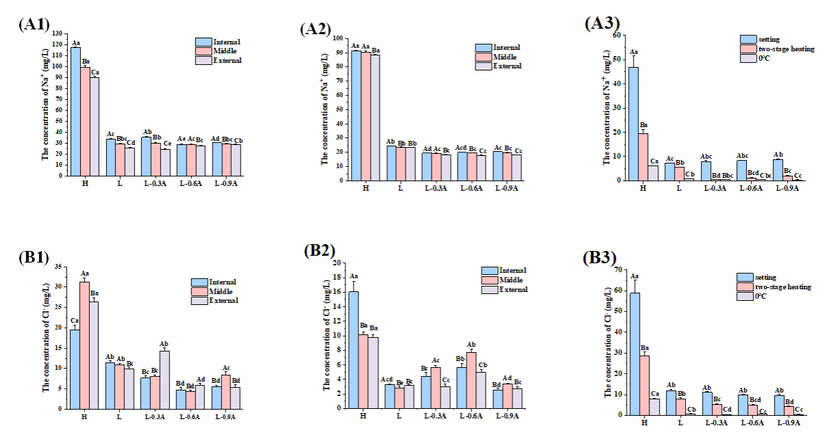 图1 L-Arg对不同加热阶段(1: setting; 2: two-stage heating)鱼丸不同部位的Na+(A)和Cl-(B)浓度的影响;A3和B3分别为不同加热阶段后汁液中的Na+和Cl-浓度的变化