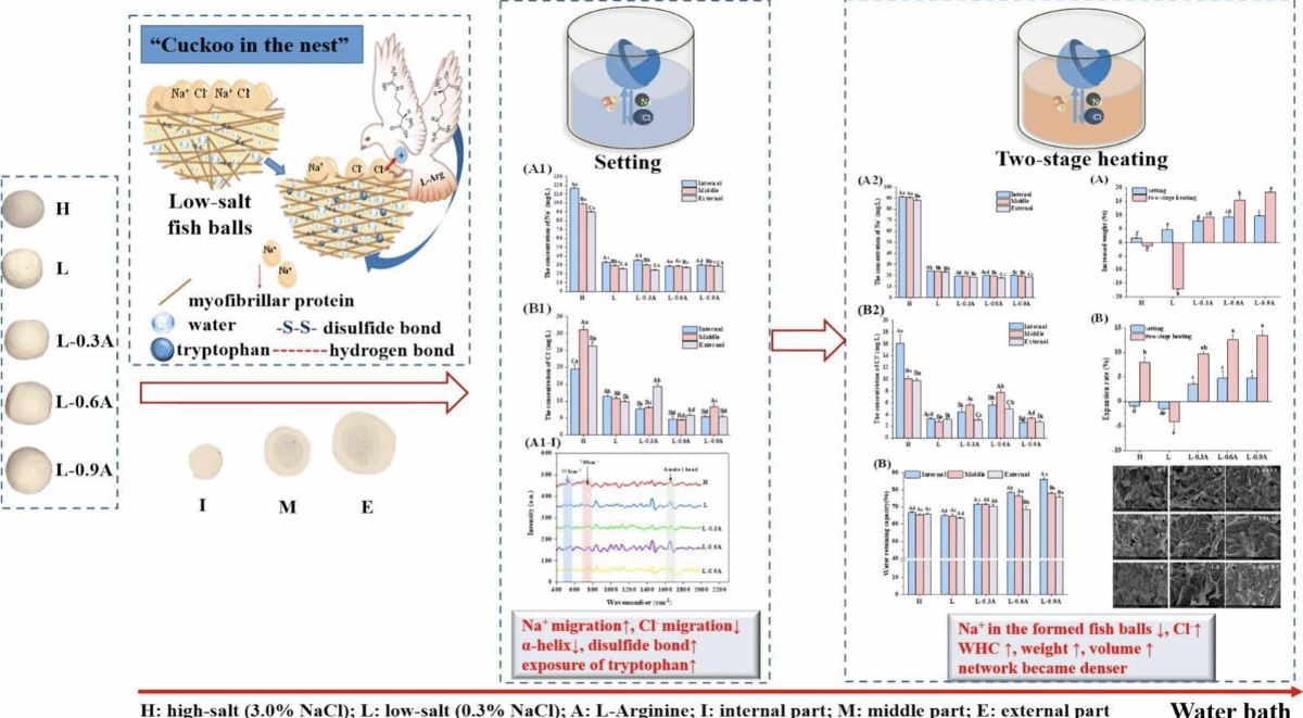 2025年5月,我院高瑞昌教授团队在国际期刊《Food Chemistry》(Q1,IF2025=8.5)上发表主题为“'Cuckoo in the nest': L-arginine promoted the migration of Na+ to ameliorate the gel quality of low salt fish balls”的研究型论文。bat365中文官方网站食品学院硕士研究生刘元秀为第一作者,高瑞昌教授、石彤实验师为通讯作者。
