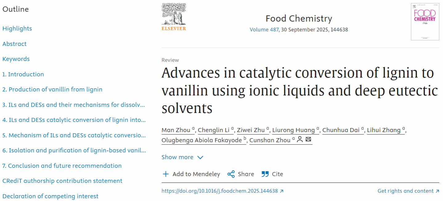 近日,我院周存山教授团队在国际Top期刊Food Chemistry上发表主题为“Advances in catalytic conversion of lignin to vanillin using ionic liquids and deep eutectic solvents”(2025, 487, 144638)的综述文章。bat365中文官方网站周存山教授为通讯作者,周曼副教授为第一作者。本项工作得到了国家自然科学基金的支持。