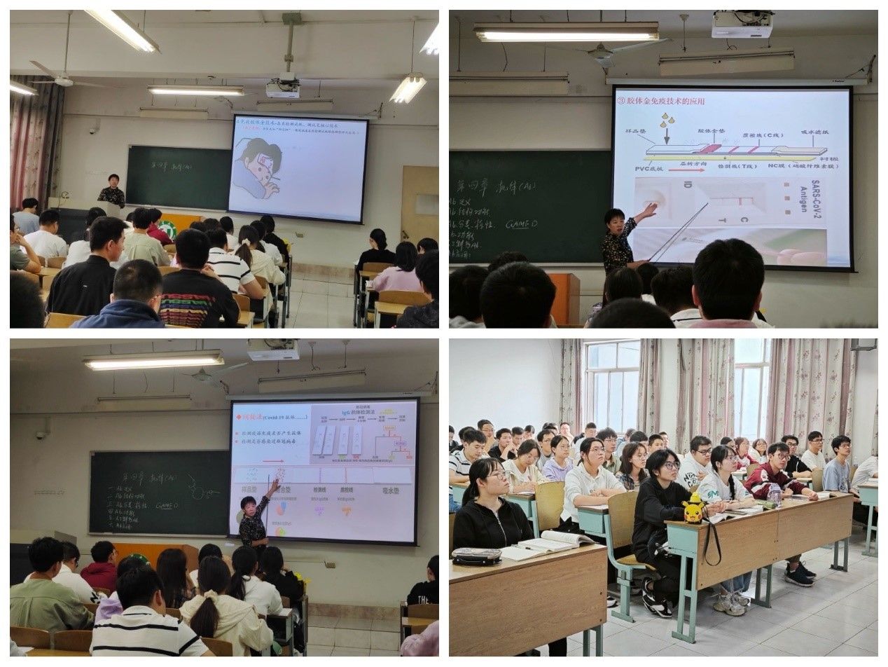 课上,蔡梅红老师在简单回顾上节课堂讲授的抗体的免疫学应用(免疫荧光技术、酶联免疫吸附技术、免疫放射技术)内容基础上,引出本节公开课的新内容—免疫胶体金技术。蔡老师结合我们刚刚经历过的新冠病毒疫情,运用了2022年bat365中文官方网站优秀教学案例《居家也知“阳没阳”新冠病毒抗原测试纸的原理及应用》,生动并深刻地讲解了胶体金的定义、免疫胶体金技术的应用特点及应用三部分内容。在深入浅出讲解专业知识的同时,生物技术专业广阔前景、勇于专业探索等思政内容设计方面也自然流畅,不刻板生硬,易于接受,在实现有效知识传授的同时,也促进了专业素养的培养。本次课堂设计、课堂互动、教学效果均得到了同学们和观摩教师的一致称赞。