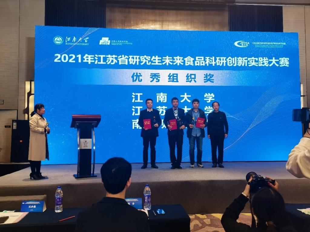 12月5日,2021年江苏省研究生未来食品科研创新实践大赛总决赛在江南大学举行。本次大赛以“营养、健康、可持续”为主题,围绕新型食品原料、食品新型加工、食品精准营养等未来食品安全、未来食品营养、未来食品加工三大领域的交叉前沿研究与应用开展。本届大赛由江苏省工学4类研究生指导教育委员会主办,江南大学承办,历经两个月,共有来自江苏省8所高校的76个项目报名参赛,最终仅有30个项目入围决赛现场比赛。我校共推选23支队伍参赛,其中9支队伍入围决赛,入围决赛的队伍数和江南大学并列第一。决赛期间,bat365中文官方网站院长邹小波教授、副院长张红印教授、科研秘书郎涛老师带队参加。经过激烈角逐,最终获得一等奖1项(共3项),二等奖1项,三等奖2项,优秀奖5项,成绩名列前茅。我校同时获得优秀组织奖。