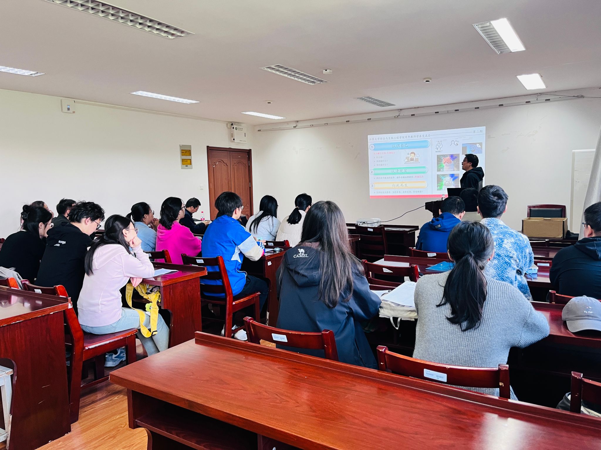 10月31日,食生学院在文华楼506举行青年教师学术交流会,学院王博老师应邀作主题为“论持久战-压力自我调节的几点感悟”的报告。学院青年教师代表和部分研究生等30余人参加了会议,会议由副院长周存山主持。